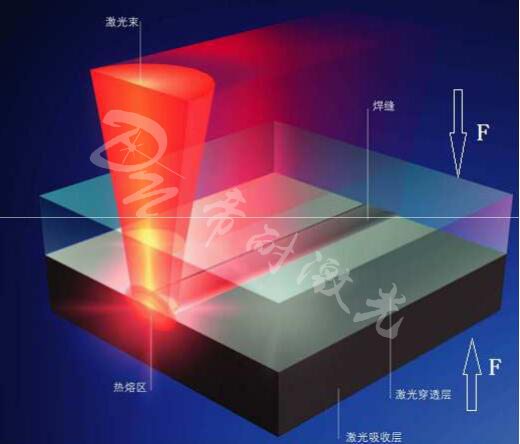 塑料激光焊接原理:通過(guò)壓力將兩個(gè)待焊接塑料零部件結(jié)合在一起,將一束紅外激光定位于待粘結(jié)部位,激光束透過(guò)上層透光材料,被下層材料吸收,吸收的激光能量轉(zhuǎn)換成熱能,由于兩層材料被壓在一起,熱能從吸收層傳導(dǎo)到透光層上,使得兩層材料熔化并結(jié)合。同時(shí)由于材料本身的熱膨脹擴(kuò)張產(chǎn)生內(nèi)部壓力,內(nèi)部壓力與外部壓力共同作用確保了兩部分的堅(jiān)固焊接。對(duì)于產(chǎn)品本身是不吸光的下層材料,需要添加吸收劑進(jìn)行處理。